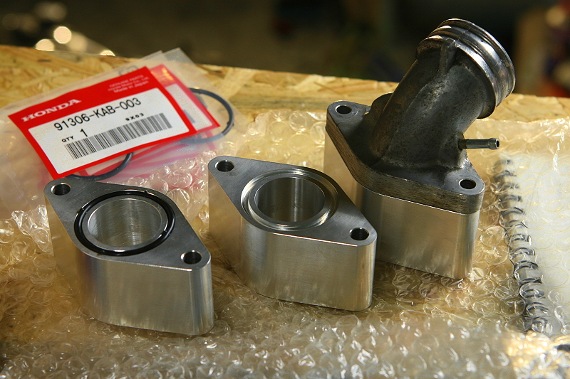 そして今回のMF06 フォルツァへのFCRキャブの装着に伴い、フォルツァの純正マニにそのままFCRを装着しようとするとFCRキャブのフロート部分がエンジンに当たってしまい取り付けが出来ませんので、以前の旧Blogで紹介したこちらのインマニに付けるアダプターを純正のインマニに履かせてクリアランスを確保するのですが、