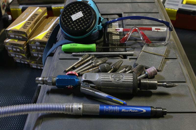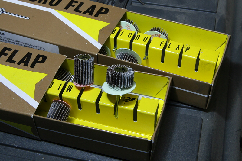 そんな訳で自分が今まで作業をしているうちに徐々に集まっていったポート研磨用の道具入れの中身を出すとこんな感じで、工具箱の中には他にもいろいろ没になった道具があるのですが、出先で形状や仕上がりなどが気になって買ってみたものの、二度と日の目を見ることなくお蔵入りになってしまうパターンが多く、いろいろ買い漁ってみても自然に毎回使う種類は限られてきます^^;