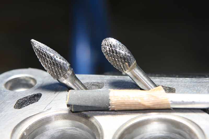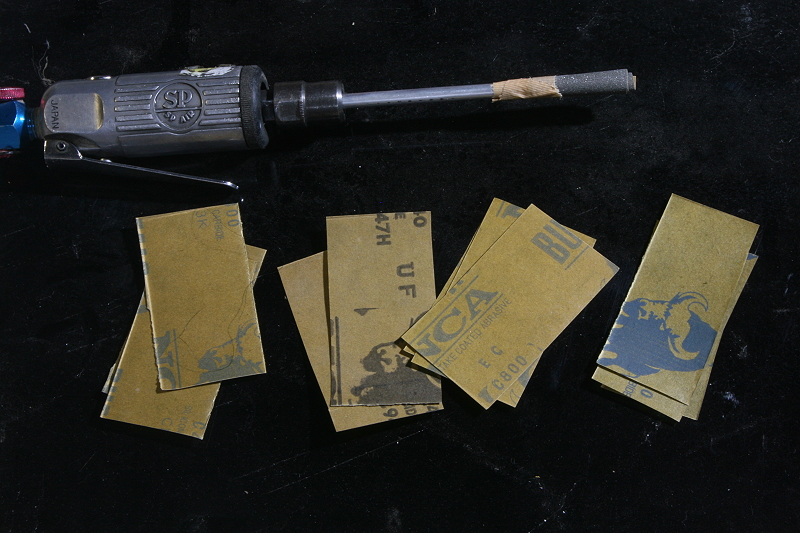 そして上の超硬バーなどを使って荒削りした面を綺麗に整形するのに使用するのが画像のマイクロフラップですが、これは紙ヤスリが何枚も軸棒に取り付けてあるのもで#60〜#400までの荒さをサイズの違う2種類を自分は使用しています。が、先ほども言いましたがこのマイクロフラップはコストパフォーマンスが非常に悪く、一個あたり450円ほどするのですが、ポート2箇所分持つか持たないかなので自分は極力使わず、ここぞという場面 (ここぞという場面=面倒臭いときw ) 意外は画像右のホームセンターで売っているアルミの3mm位の棒に糸ノコで切れ込みを入れ、そこに耐水ペーパーを適当なサイズに切ったモノを差し込んで固定し、画像のように巻いたうえでガムテープなどで止めて、表面がダメになったら少しめくって綺麗な部分を出してを繰り返しながら作業をしています。
