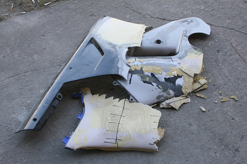 そんなこんなで一応スカイラインの顔面SWAP作業にも一旦目途が付きそうな予感ですが、そんな中で12Rの顔面SWAPはといえば・・・前回ミスして急遽修正に入ったBUSA顔面SWAPカウルでしたが、今回は仕方なく時間の関係上で証拠隠滅とばかりに粉砕してしまいました・・・。