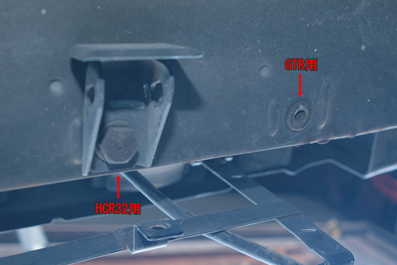 ちなみにBNR32のタンクをHCR32に載せ換える場合はBNR側のマウントステーを使って取り付けるのですが、取り付けネジの位置もBNR32と違ってHCR32はシャシーが多少違うので画像のゴムでメクラをしてある部分を使い、もう一方はネジを入れる穴が下側に開けてあってもナット側が付いておらず、トランク側のアンダーコートを少しだけ剥がして、鉄板を少し切って上からナットを入れて共締めして取り付けます。多分、HNR32はRと一緒なので無加工です。って今さらR32イジる人も居ないですよね。。。