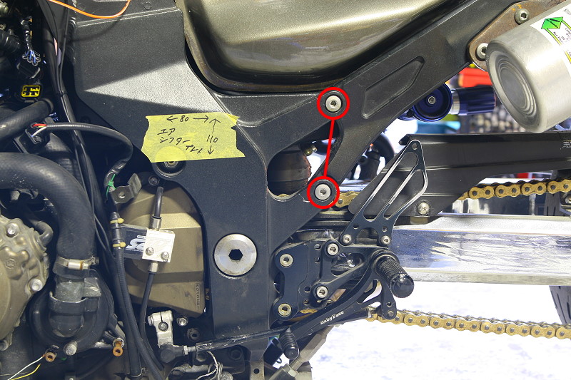 そこでまずは取り付けをどうするか?ですが、ステップ周りで取り付けに使えそうなボルト部分はエンジンマウント部分とシートレール部分、それとステップのヒールガード留めネジ部分ですが、その中で今回は、角度などを考慮して画像〇で囲ったシートレール部分のネジ穴を使って取り付け出来る様に作ります。