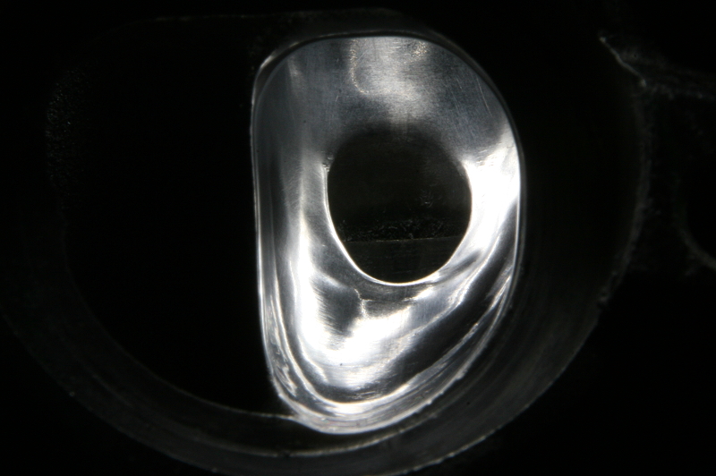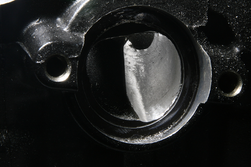 そして右のシートリング付近ですが、ここをあまりにも拡大してしまうとエンジンが高温になった時にシートリングが脱落する恐れがあり、一瞬のミスでバルブの当たり面を傷付けてしまうと酷い場合にはシートリングの入れ替えとなりますので注意が必要です。