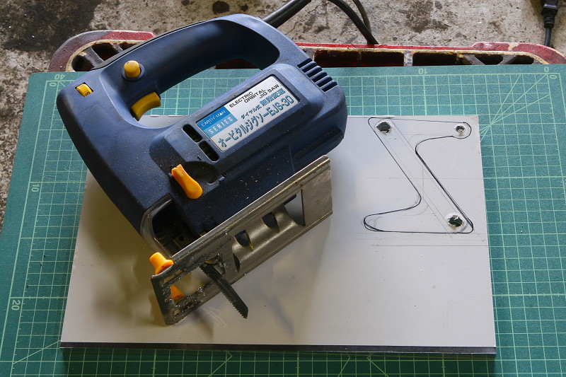 そしてカットするのに必要なのは本来なら卓上の糸ノコなどがあればいいのですが普段滅多に使うモノではないので、今回は以前に車の内装を作る時にMDFを切るのに購入したホームセンターの格安ジグソーを使ってカットします。