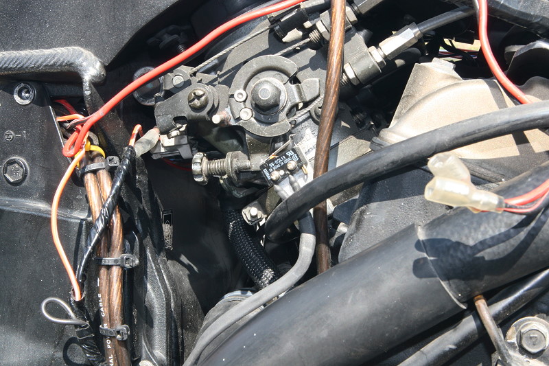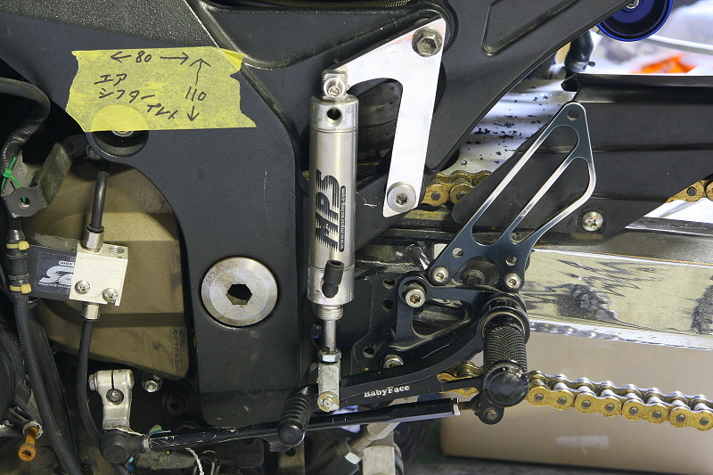 そして話は戻って、画像のエアシフターブラケットの取り付けてあるシフトリンク部分とシフトレバー端部をワイヤリングしていますが、これは大した意味は無く、ただ単にリンクシャフトのネジ山がエアシフターが作動する度に瞬発的な衝撃(インパクト効果?)に耐えられなかったのか、走行中に突然バカになってしまい、仕方なくそれ以来ワイヤーでテンションを掛けてシフトダウンの時にスッポ抜けないようにしていますw