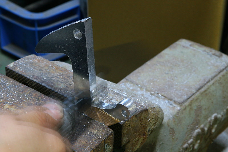 ちなみに手前の材質は当初10mm厚で注文し、予想に反して厚みがあり過ぎたので却下したA7075の超超ジュラルミンと言われる材質ですが、今回制作したA2017 ジュラルミンよりも強度がはるかに上な材質と言う割には、加工や磨きはA7075の方が全然楽で、逆にA2017はペーパーで綺麗に面を研磨してもバフを掛けると表面が粗くなってしまい、熱の入るバフ研磨には向いていないのでしょうかね?