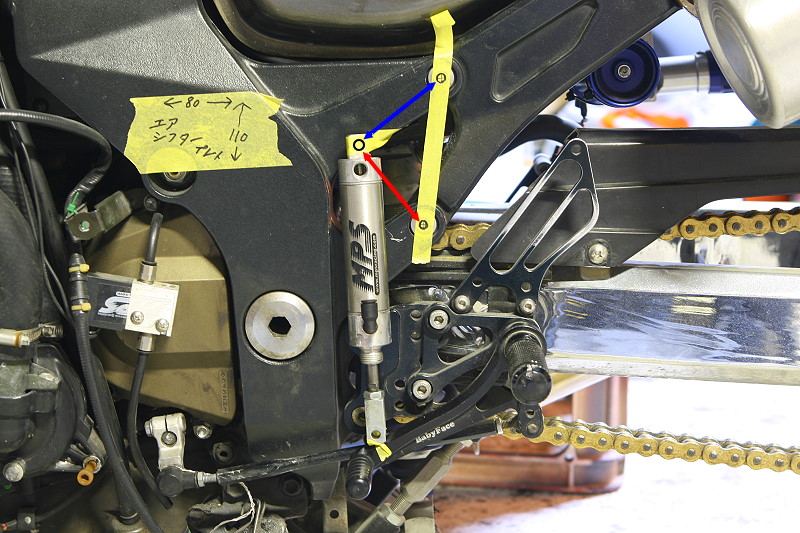 そして次に、今度は実際にエアシフターのシリンダーを配置する位置をテープなどを使って仮決めして、位置が決まったら画像の青と赤の矢印の寸法を測っておきます。