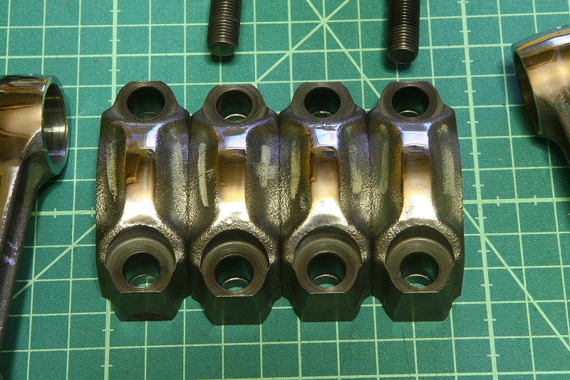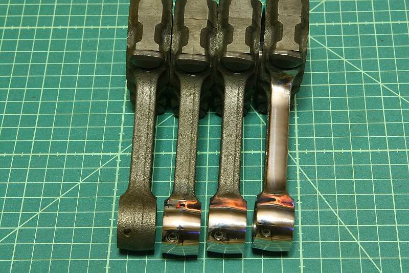 ということで(どういうことで?w)、とりあえず今回のコンロッドに対する考えは、ロッドの破断よりも曲がりに対する強度を確保するため、応力の集中を防ぐ側面の鏡面加工はせず、必要分の重量合わせだけで使用する事にしたのですが、実際に重量合わせを行ったところ左画像の状態で一本だけ側面も研磨しないと他の重量に追いつかない状態でした。。。