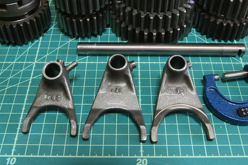 そして上のギヤをシャフト上で右に左にと誘導してギアチェンジを行っているのが画像のシフトフォークですが、こちらもシフトフォーク先端の爪部分に結構な負担が掛かっていますので異常が無いかをしっかり点検します。