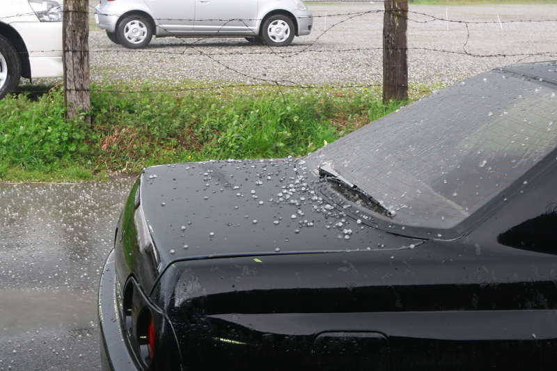そんなこんなで作業も終わり睡魔と戦いつつ呆然としていたら雷がゴロゴロと鳴り始め、雷が好きなのでどっかに稲光落ちないかなぁ・・・と外をずっと眺めていたら人生で最大の雹がw 一瞬 ”オイッ!”と心の中でツッコミを入れつつガレージ内は作業後でスカイラインが入れなかったのでスカイラインに ”スマン!”と思いつつ見守ってました^^: でも余りにも雹の威力が強かったら無理やりでも仕舞おうと思い、実際自分も外に出て雹に当ってみたのですが、この程度だと全然痛くないんですね^^
