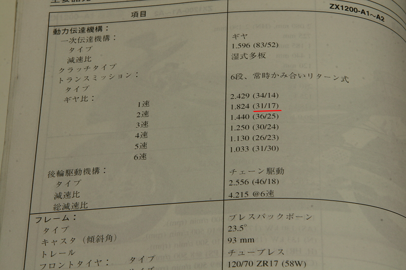 ちなみに今回ミッション制作に伴い主力候補のギア比なども複数調べてみたところ、下記のデータからZX14の開発者の秘密が分かりました。