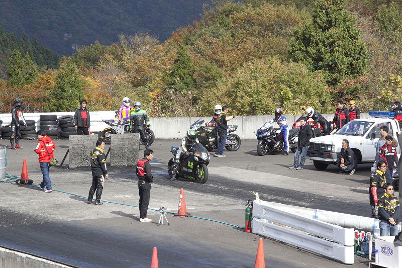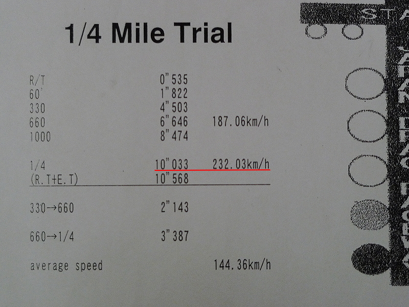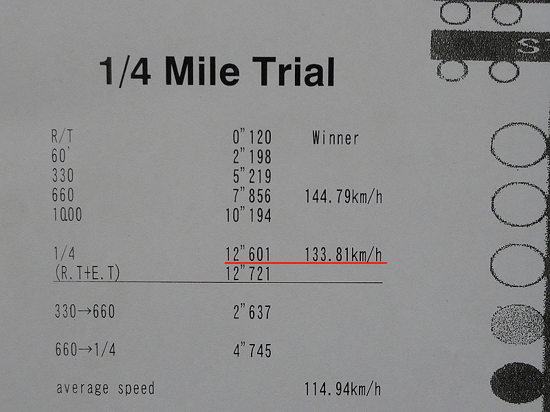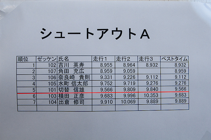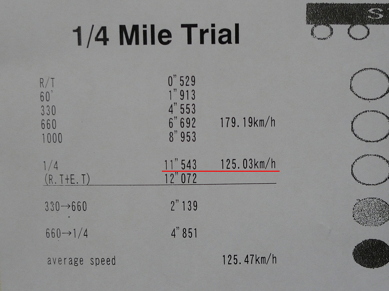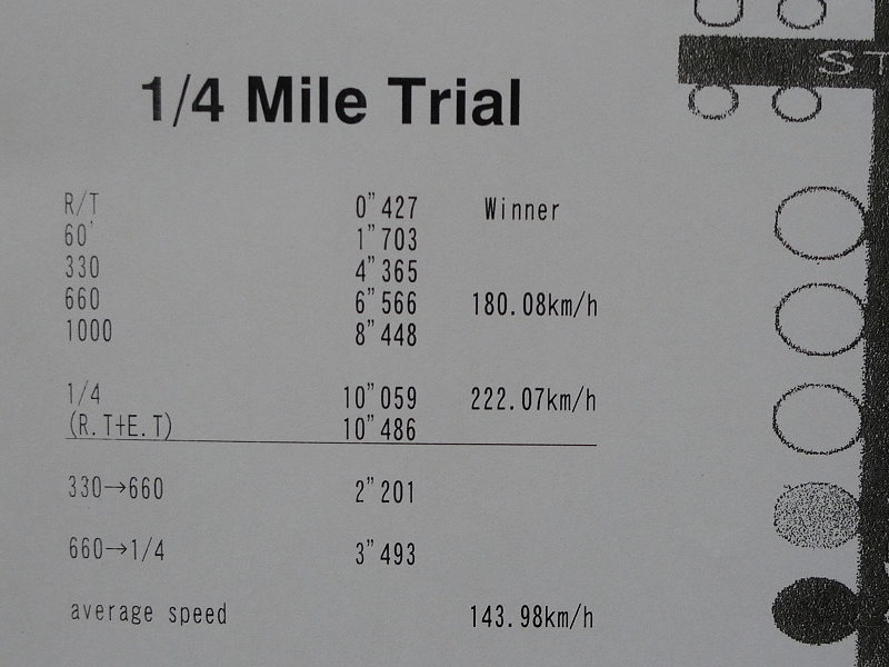 そんなこんなで今年の仕様はNOSの助けもあって、去年のモッサ〜っとした周りを見ながら走れる余裕のある加速感からシフトランプの点滅に対する反応に手こずる程度まで進化したので、エアシフターのシリンダーがスモールタイプだから力が無くて弾かれるのか?などと、いろいろ原因を探りながら残りの予選2本を走ったのですが、セッティングが煮詰まれば煮詰まるほどシフトミス連発でタイムが落ちる悪循環に嵌まり、予選が終わってみればタイムもズタボロになってしまい、結果はこんな感じでした。。。