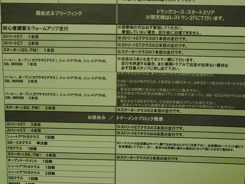 と思ったら、今回は本当にいろいろ予想外なことが多くて作戦の仕切り直しの連続だったのですが、土曜のフリーに参加している人は日曜に参加受付をしなくても良いようにとの配慮で土曜日のフリー走行終了後に受付をすることが出来たので、それなら自分も・・・と受付を済ませてタイムスケジュールを受け取り見て唖然。。。