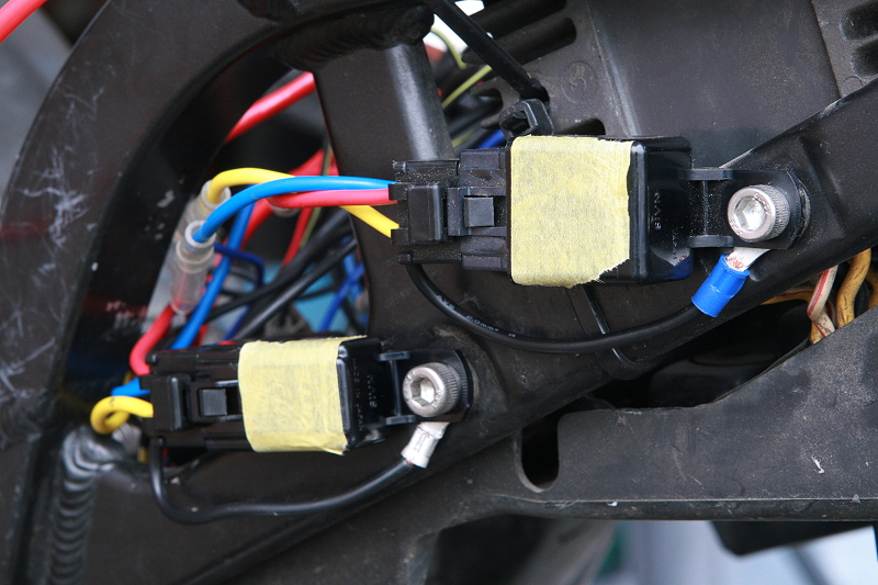 そして画像は燃料ポンプハーネスとメインハーネスとが繋がる部分のカプラーですが、メインハーネス側が1.25SqのハーネスでECUから電流が流れてきているのに対し、燃料ポンプ側のハーネスは2.0Sqで作られおり、ポンプ側だけ太くてもメイン側が細いのでは高回転時などに本来の電圧が確保出来ない場合があるのでメイン側も太くします。
