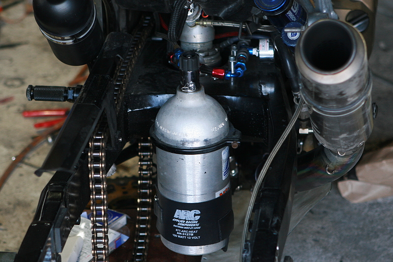 あとはNOSのセッティングですが、時期的に気温が下がりボトルが冷えるとボトル内の残圧が減って噴出圧力が低下しても燃料側は電磁ポンプによる圧力で噴射するので供給量は変わらないということで、状況的にボトル内の圧力が下がれば混合比がズレて燃料が濃い状態になって走る度に燃調も徐々に濃い方向に変化してしまうので、出来るだけ一定の噴出圧力をキープ出来るようにボトルヒーターも用意し、ボトルを暖めて内圧を上げられるようにしました。