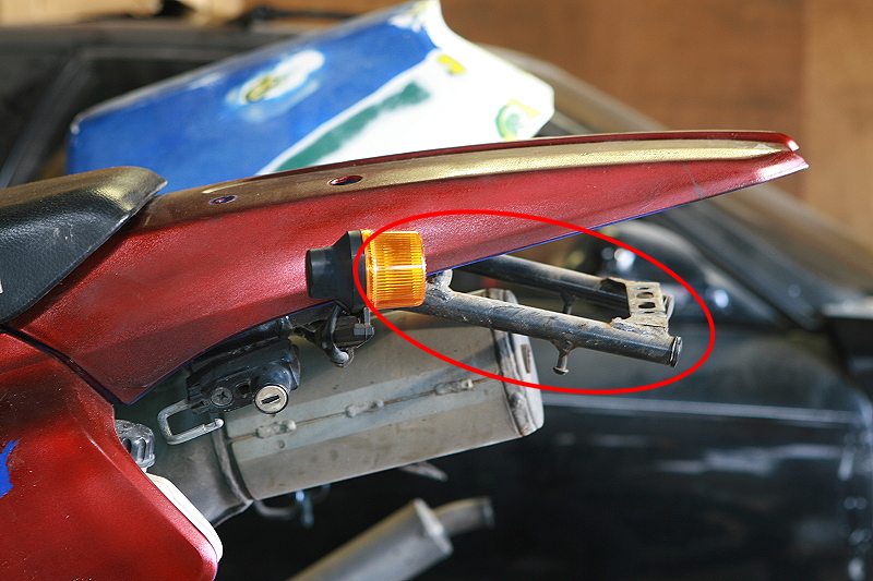 そこでよくある対処方として不要な部分のフレームをカットしたり、露出しているフレームを隠すようにナンバーを取り付けるなどの対処をすれば問題解決ですが、フレームカットの場合はNSR250やZX12Rのようにシートレールがボルトオンで取り外しが出来るのであればシートレールを加工してしまっても純正のシートレールを用意すれば元に戻せますが、今回は一度切ってしまったら元に戻せないので却下。