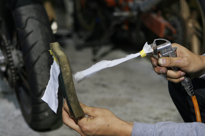 また、実際の環境はエアクリーナーBOX内の閉ざされた空間で、今回の実験はオープンな状況なのでフィルターに当たった風が横に逃げてしまいますが、エアガンから出る空気はコンプレッサーにて5kgf/cm2に圧縮された空気をスポットで噴射しているので、状況的に局部的な風圧は今回の方が強いハズです。