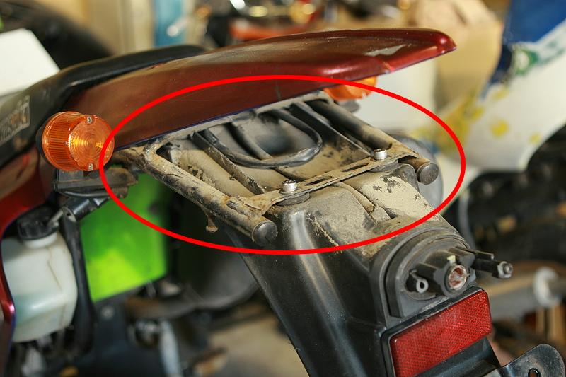 ということで作業開始ですが、KLX250とDトラッカーはフレームやエンジンなど色などが違っても大まかに足回りと一部の外装以外は構成パーツが同じ兄弟車種なので、外装も足回りも基本的にはポン付けでイケてしまうのですが、Dトラッカーが途中の04年式からシュラウドとリアフェンダーがモタードっぽくシャープなデザインに変更され、そのタイプのリアフェンダーを付けると画像のように元々垂れ下がっていたカウル形状に合わせたフレーム部分が思いっきり外に露出してしまいます。