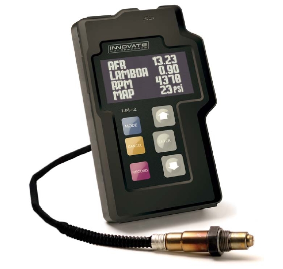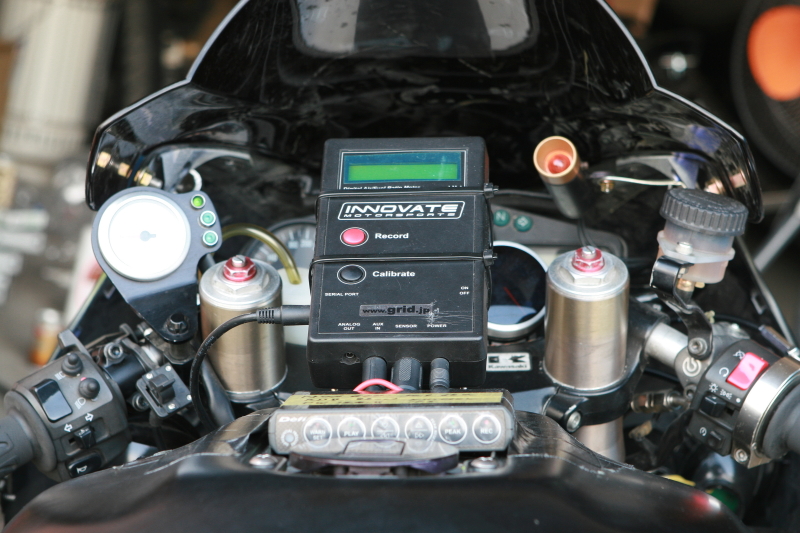 そして具合が悪いといえば、普段セッティングやレースの際に空燃比やアクセル開度などの各データをロギングしてくれる画像のINNOVATE社製のLM-1データロガーですが、自分は普段から自走でセッティングしているのでLM-1のボタン操作などがしやすいようにと以前に仲間にステーを即席で作ってもらい、画像のタンク上部に取り付けているのですが、前回の第〇京浜も今回のセッティングもここに本体を設置しているが為に高速域で上半身が全く伏せられず、ヘルメットに受ける風圧を首でもろに支えているので走り終わった次の日などは首が回らないくらいに痛くなります。。。