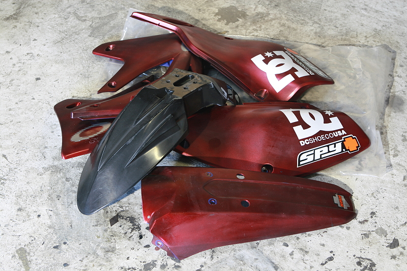 とりあえずこの外装を購入した当時は確か、このカウルで型を取ってカーボン外装でも作ろうか?と考えていたハズ(KLX用と書かれたカーボンクロスも同時に発掘しましたw)ですが、今は他の作業に専念したいのでとか言いつつカーボンは12Rでいろいろ使いたいので・・・w、どうせウイリーの練習でコケること確実ですし逆にコケるの勿体無いから嫌だとか思うと思いっきり練習できないので、どうでもいい遊び感覚でこのKLXから塗装を開始します♪