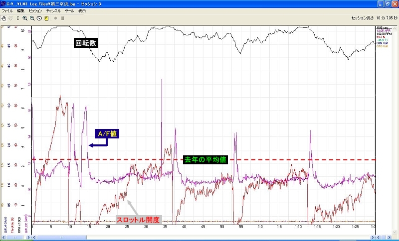 画像のグラフはその時の状態をロギングしたA/F計の推移(時間短縮)ですが、全域にわたって去年の平均値の破線部分よりも燃料が濃くなりA/F値(空気と燃料の比率)が濃い側に下がっています。