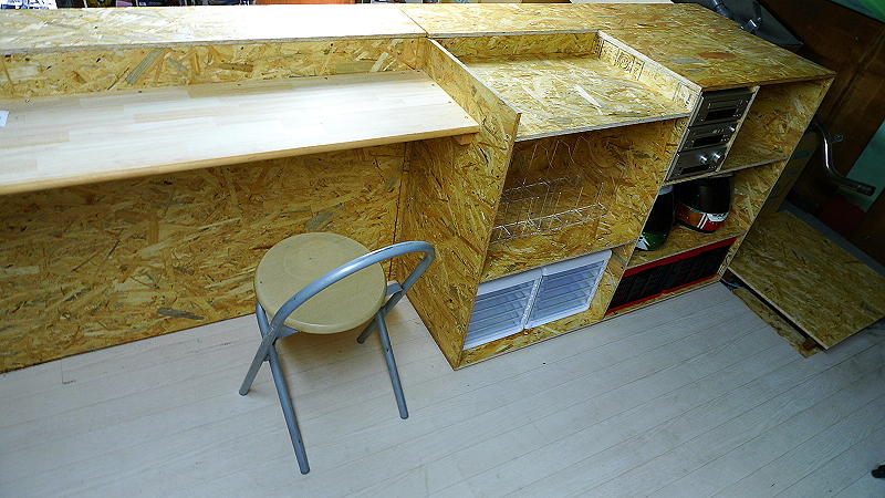今年に入ってからガレージの大掃除を始め、仕舞いきれない部品などを仕舞うスペース確保のために棚を作る予定が急遽、休憩スペースを作ることになった例の計画ですが・・・