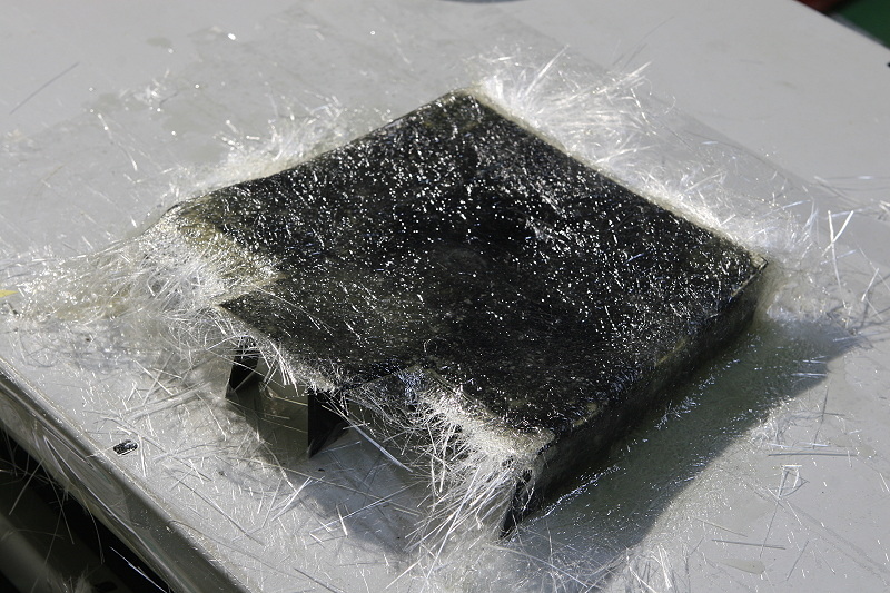 そしてFRPの張り込みですが、今回は他の作業で使用した時に余った廃材部分のFRPマットを手でちぎり、それをほぐしながらハケで樹脂を塗りこんでの作業ですが、今回はエンビ板がペラペラで圧を掛けると型が変形してしまうので脱泡はせず張り込んだままエア噛みなどは後々修正していく方向で作業し、張り込みが完了したら硬化するまで放置します。
