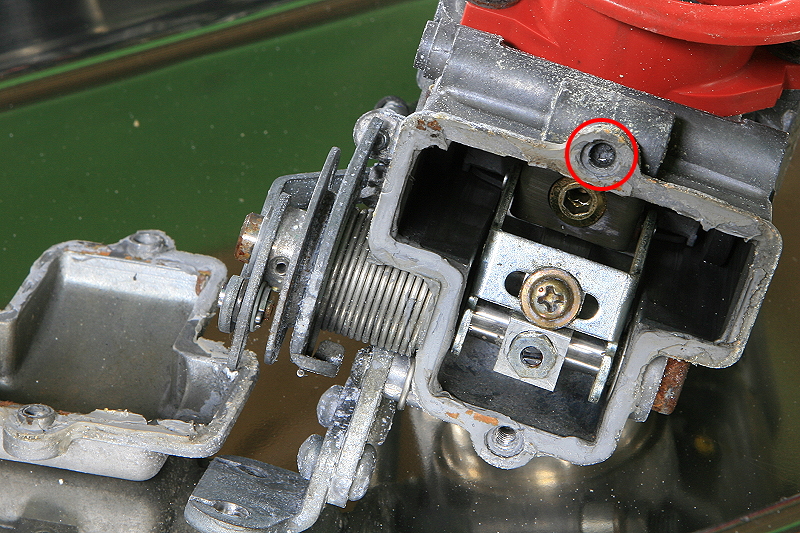ということで目的定め早速オーバーホールの開始ですが・・・、まずは今回のキャブで見た目に一番残念な事になって気になるキャップ部分を外すと、思ったとおりネジ穴をナメたが為に液体ガスケットでベッタリ貼り付けていたようで・・・。