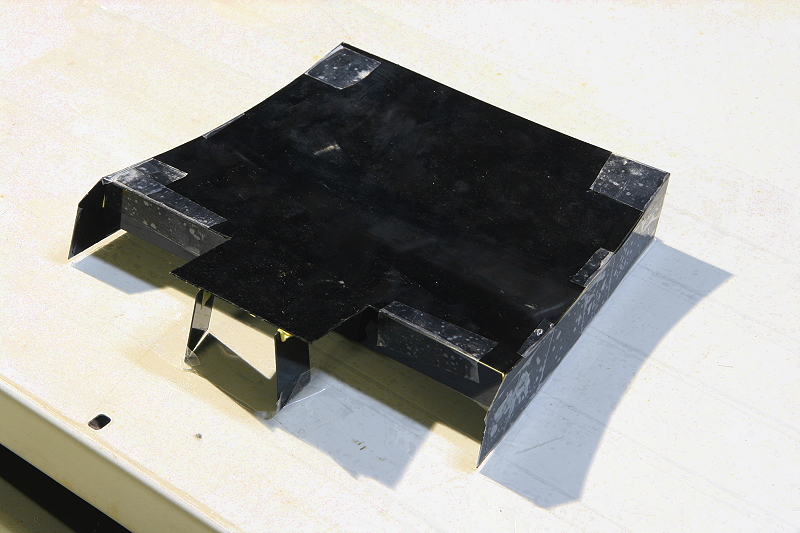 ということで、早速型取り開始ですが、この画像は去年末の深夜に作業の合間の一服ついでに行った作業なのでかなり適当ですが、まずはデザインしたエンビ板の型を取る為に作業台に置いて、エンビ板がペラペラですぐに変形してしまうので、FRPの蓄層の際に型崩れを起こさぬよう裏側の何箇所かに補強として余ったエンビ板を貼っておき、下の作業台にもFRPが貼り付かぬよう必要箇所をビニールテープでマスキングしておきます。