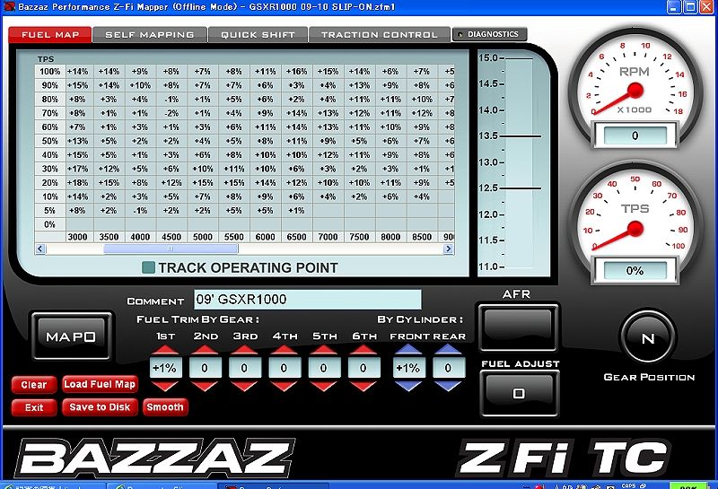 画像のMAPデータはあまり見慣れないバイク用FI(99’GSX1300R)の純正ECUのIgnとFuel MAPの中身を解析して専用のソフトで表示変換を行い純正ECU内の情報を書き換えるROMチューニングの設定画面ですが、純正ではメーカーごとに基準や表示が異なり、他のセンサー情報などとの絡みもあるのでこれらの情報をいきなり訳も分からず適当にイジるのは危険ですが・・・