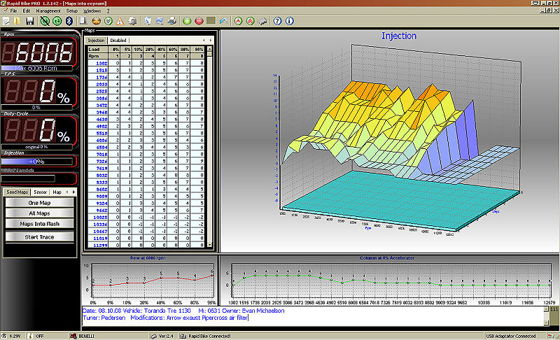 まずこちらは、前回タイヤ交換でお世話になったJAMさんが国内ディストリビューターを務めるRapid Bikeの設定画面(PRO版)で、以前からJAMさんにいろいろ機能説明などを教えて頂きオーナーにその都度説明させていただいたのですが、今回の「自分で気軽にイジる」な部分に対しては専用ソフトなどがフリーじゃ無い分、唯一使い勝手などが分からずオーナーさんを悩ませましたが、汎用モードで12Rでも使える可能性が・・・との事で、個人的にJAMさんのDRAG仕様の12Rの復活を期待しています。