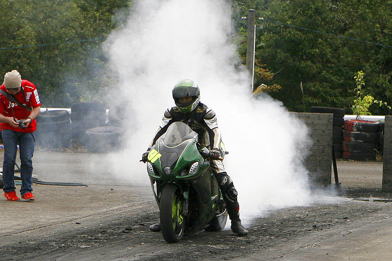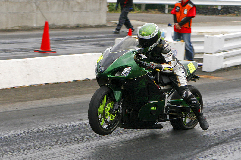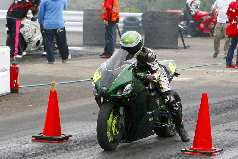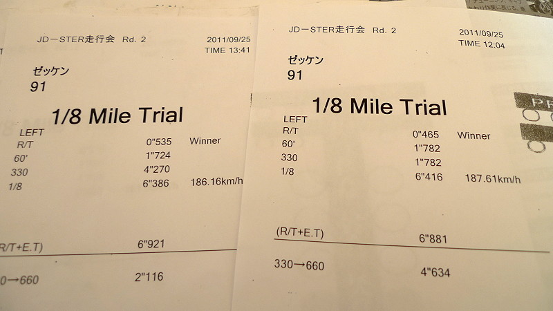 今回は震災の爪痕が残るハイランドでの開催ということでフルコースで行われる通常の1/4mile競技ではなく、約半分の1/8mile競技ということでしたが、とりあえず久々の仙台だし試験的に今年はスイングアームの長さも少し変えてみたので、リアサスや車体姿勢などその辺のスタート時のセッティングが出来れば良いかな〜?程度に考えて参加した結果・・・