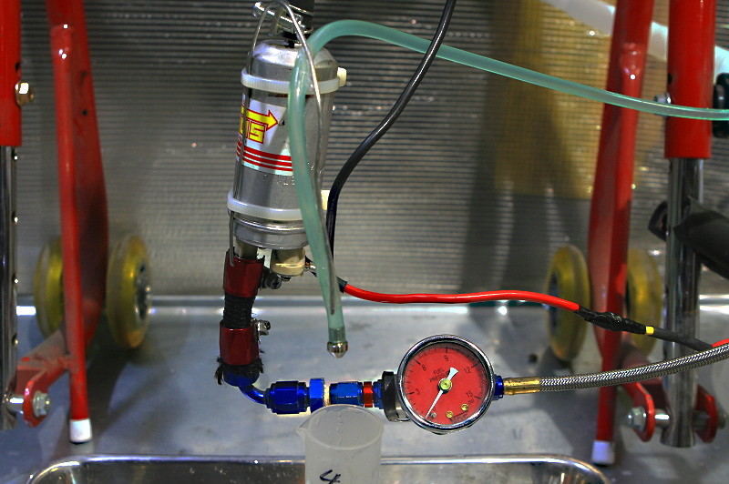 途中に燃圧計もセットし、後に他のジェットと同じ条件下での比較が出来るよう、一定圧の条件下の元で各ジェットの噴出流量を計っていきます。