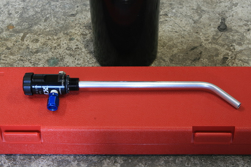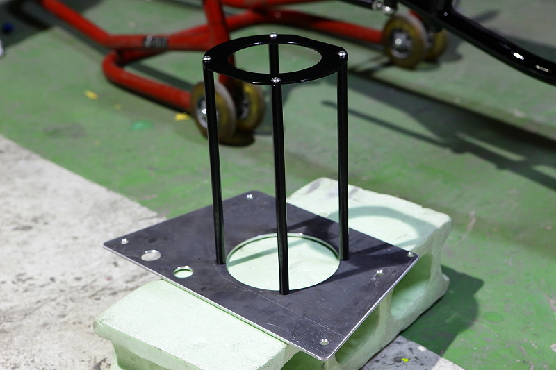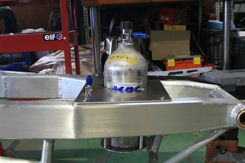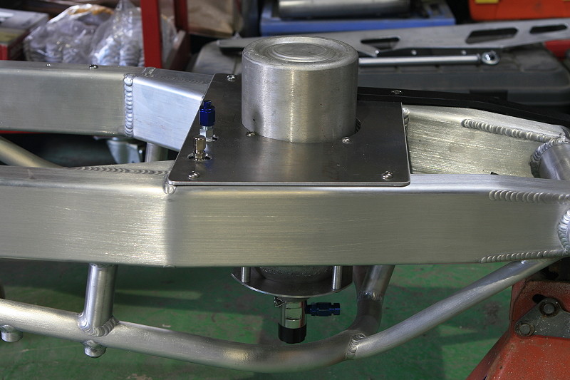 そしてスイングアーム延長による特権の一つでもあるエアシフター用のエアタンク部分のエア漏れのチェックをして、今回オプションで設定したNOSボトル用のボトルスタンドにボトルをセットしてみると見事に飛び出し過ぎで、このままではリアがボトムした瞬間にインナーフェンダーを突き破ってしまいます・・・。