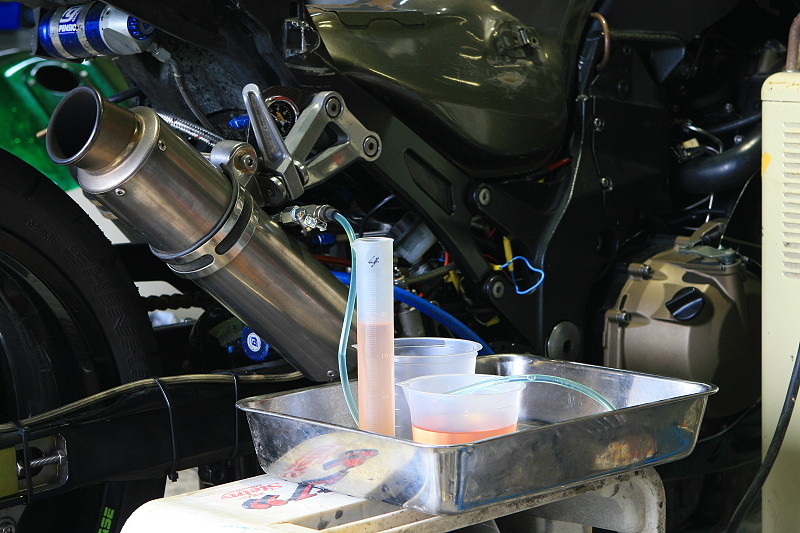 そんな経験からNOSを使い始めて思った事は、車と違ってバイクの場合はスペース的に積めるタンクの大きさにも限りがあって、使用するジェットのサイズにもよりますが2lbクラスのボトルではセッティングの為に数本走るとボトル内の残圧が下がり始め、その後は一本走る毎にタンク自体も冷えて下がるペースもグンと早くなるのに対して、燃料側は燃料ポンプにより常に一定圧の燃料が流れ出ているので何本もNOSを使用して走っていると仕舞いには燃料とN2Oガスの混合比が崩れてセッティングが濃くなります。