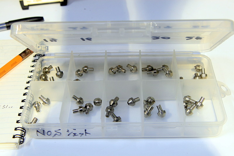 ただ、やはりキャブにしろ何にしろ組み合わせが変われば自ずと調整する内容も変わりますし、この先現場で突然のトラブルや変則的な状況に陥っても経験則で判断できるよう、はじめに思ったことはとにかく実践して失敗を多く経験して少し遠回りしてでも、自分なりにコツコツいろいろ試してみて経験を踏まえた上での考えを構築しないとモノにできなそうなので、昨年からNitrous Oxide System のSystemと言われる部分を自分なりのシステムにアレンジしようといろいろ試行錯誤し、N2Oガスの残圧に対して燃料の流量も段階的に変化させてセッティングを出来るだけ合わせられないものか?という個人的な興味の一環として、まずは基本的な問題としてジェットの番数と流量の関係を調べる実験を行ったりしてました。