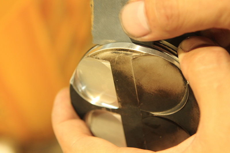 ピストンの仕上げ作業の一貫としてシックネスゲージでクリアランスを測って狭まっている分を耐水ペーパーにオイル付けてシャッシャと研磨してはシックネスゲージでクリアランスのチェックをしながらリング溝と格闘すること小一時間・・・修正無事完了♪