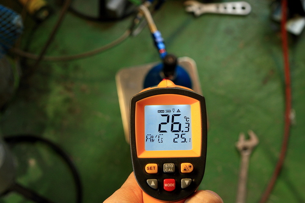 職人も何とか温度上昇を下げられないものか?と日夜研究を重ねて、今ではこのとおりリフィル前後での温度変化を小さくする技術を得たので一気に液化状態で100%以上リフィルすることに成功♪ =破裂w という嬉しいような悲しいような結果に辿り着くことが出来ました。 といっても通常は危険なのでそこまで詰めませんが^^: