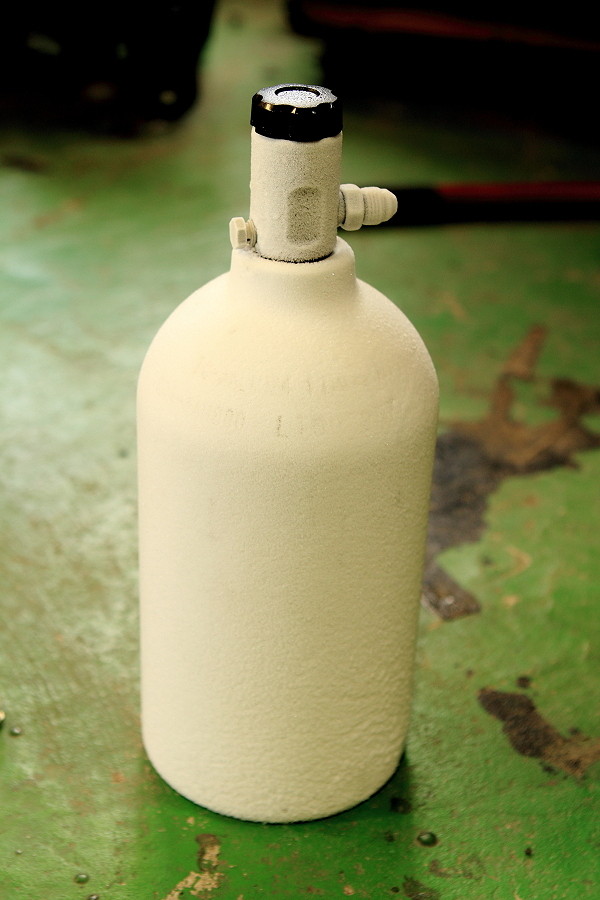 ちなみに先ほどのボトルと同じ年代か?それ以上か?・・・、こちらはマシンと共に幾多のドラッグレースの歴史を刻み、自分も2輪でドラッグレースを始める時にHPを見ていろいろマシンメイクなどを参考にさせて頂いた九州ドラッガーKさんのMy ボトルですが、この古いタイプのボトルバルブはカチッと形状が使いやすくてお洒落で、逆さまにセットした時に飛び出しが少ないので今のタイプよりも全然イケてます^^