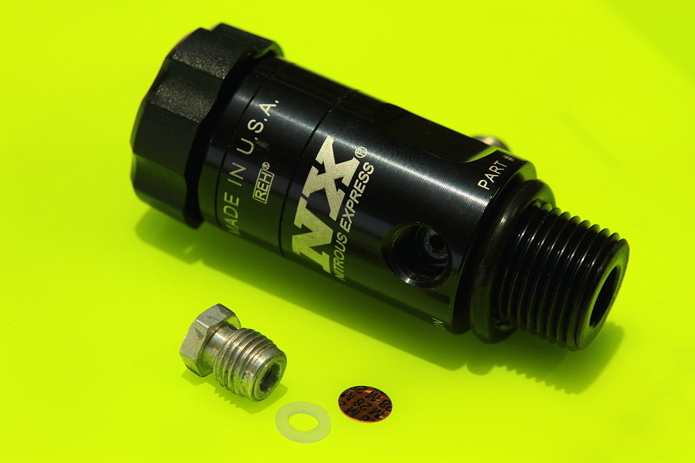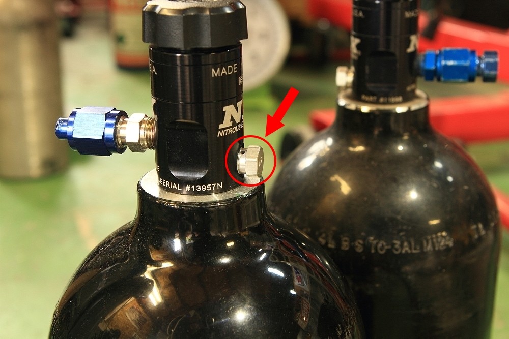 NOSのボトルでいえば ◯ のボルトのような部分がそれに当たるのですが、以前自分はこのセーフティーバルブがどう働くのか実際に見た事がなかったので、実際にガス圧が限界に達したらこのボルトがパンッ!と吹き飛んで中のガスを外に逃がすものだと思い、その飛んだボルトが弾丸のように発射されないように「ワイヤリングしとけよ」って意味でボルトに穴が開いているのかな?なんて思っておりましたが、
