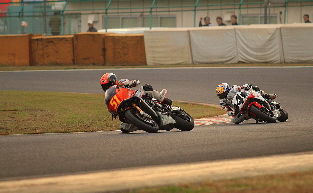 午前中の予選で3番手に着けたコーイチさんですが、決勝では3番グリッドからいつものスタートダッシュで先頭の2台をパスしてホールショットを奪い、そこから予選1位のYZF-R1のエンジンをスワップした#4FZさんの猛追をかわしながらトップで先行するものの・・・