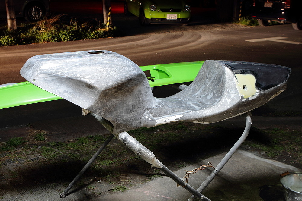 で、遅れている外装製作も先行しているサイドカウルとアンダーカウルに追いつけるべく、シートカウル一体成形のタンクカバー製作に着手したのですが、