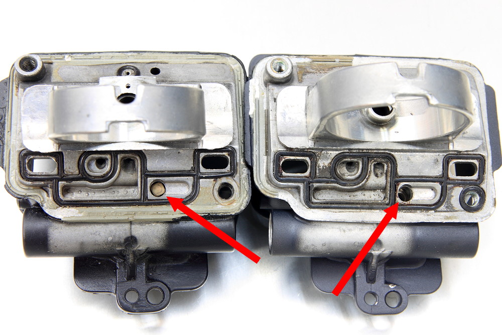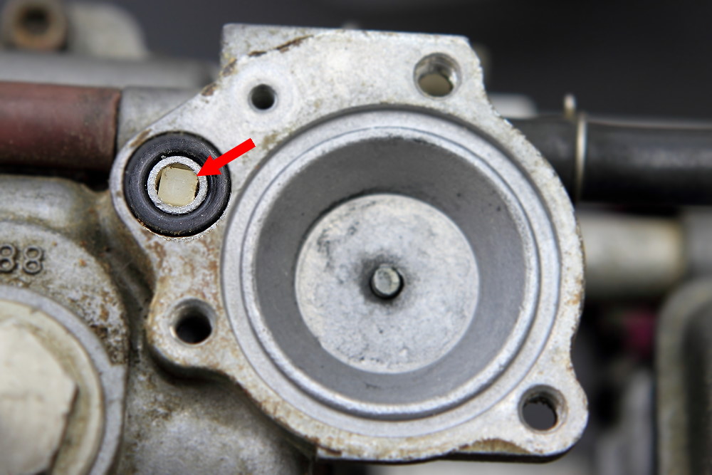 その別の溶ける部分とは画像の矢印で指した加速ポンプ機構のワンウェイバルブ部分なのですが、