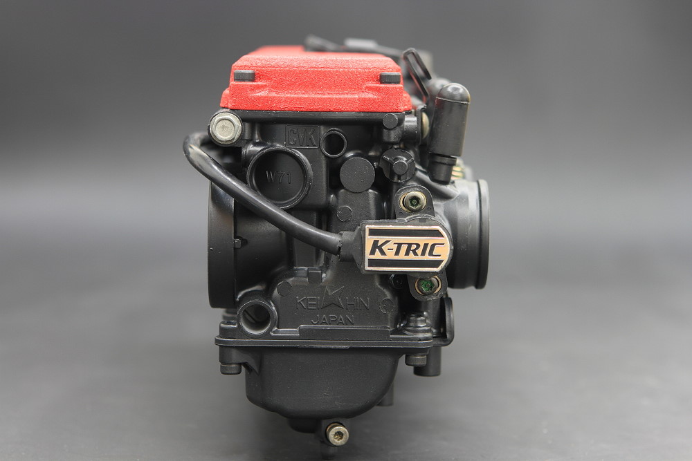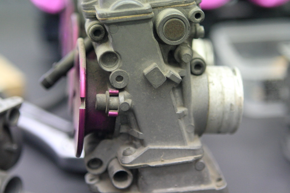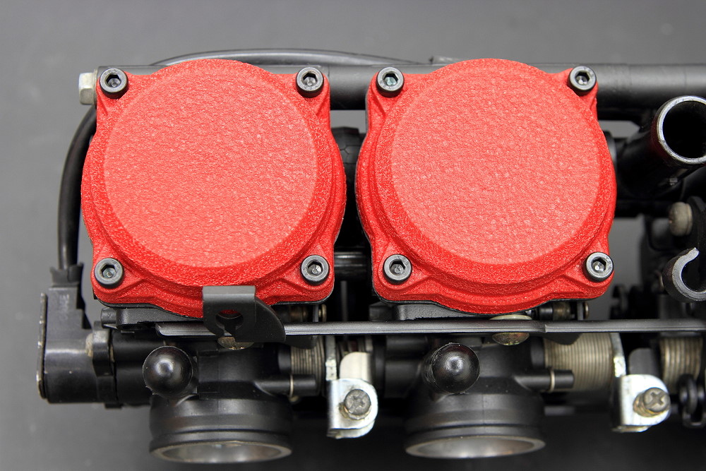 また、画像のようなTPS (スロットルポジションセンサー)などが付いているキャブでも特殊なモノを除き、取り外し、又は分解出来る物であれば塗装完了時に元の状態に合わせて組み付けますので今のところ問題は出ておりませんが、スロットル周りも完全に分解しますので組付け時に出荷時と同じように機械同調は取りますが、事前に同調を取ってあった場合には再度エンジンに取り付け後の微調整が必要となります。