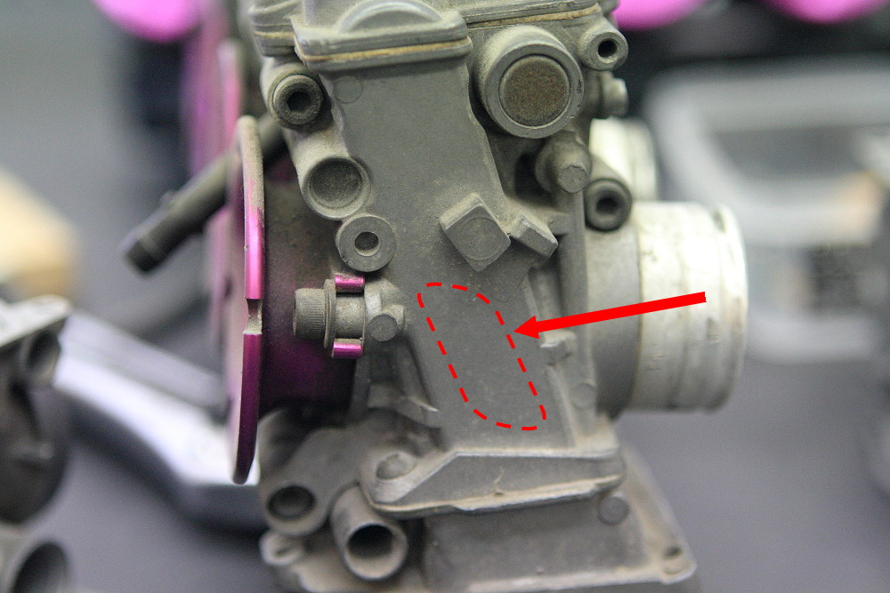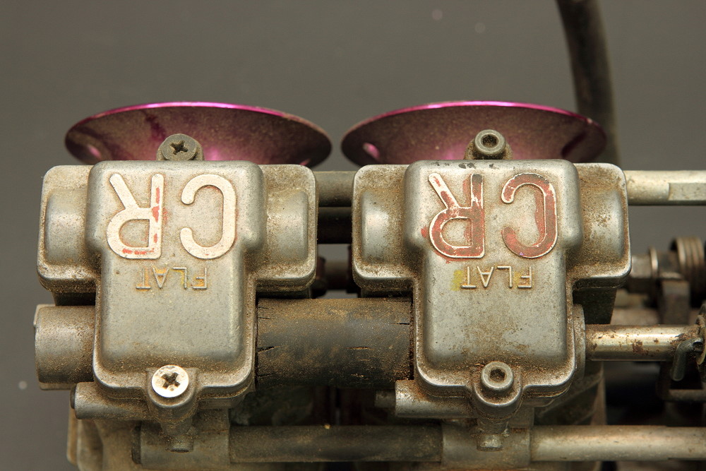 そんなこんなでジュラコンタイプのFCRキャブかを見分けるには加速ポンプのダイアフラム部分のカバーを外して直接確認するのが確実ですが、外見上でも取り付けた状態でキャブの右側の側面にステッカーを貼る枠のような塀が無い古いタイプは今のところ100%ジュラコンタイプとなっております。