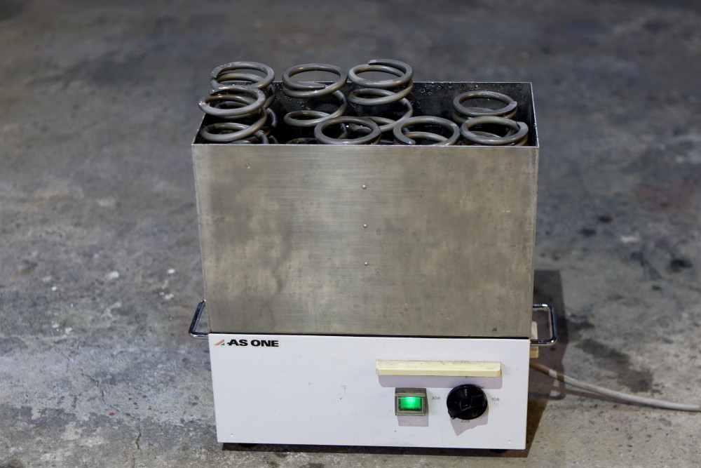 普段ブラスト作業を行った後には細かなメディアの残留物を取り除く為に超音波洗浄を行うのですが、この超音波洗浄はいかにも電気が漏電しているようなバリバリ音が響いて意外に音がうるさく、毎回ガレージの軒先に出して洗浄しているのですが、