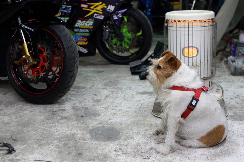 近所の釣り具屋さんに居候中のチョコは、暇になるとお店の自動ドアを自分で開けてトコトコとガレージに遊びにくるのですが、作業に没頭していてふとした瞬間などにチョコの存在に気付くと、普通にストーブに当たっててだいぶオッサン化(♀ですがw)が進んでいるなと。