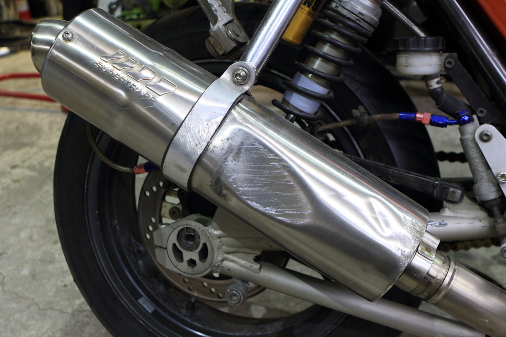 このマフラーどうした?と聞いたら団地の車両止めを通ろうとしてブッ潰したらしく、これで車両止めの意味が勉強出来たとか・・・。