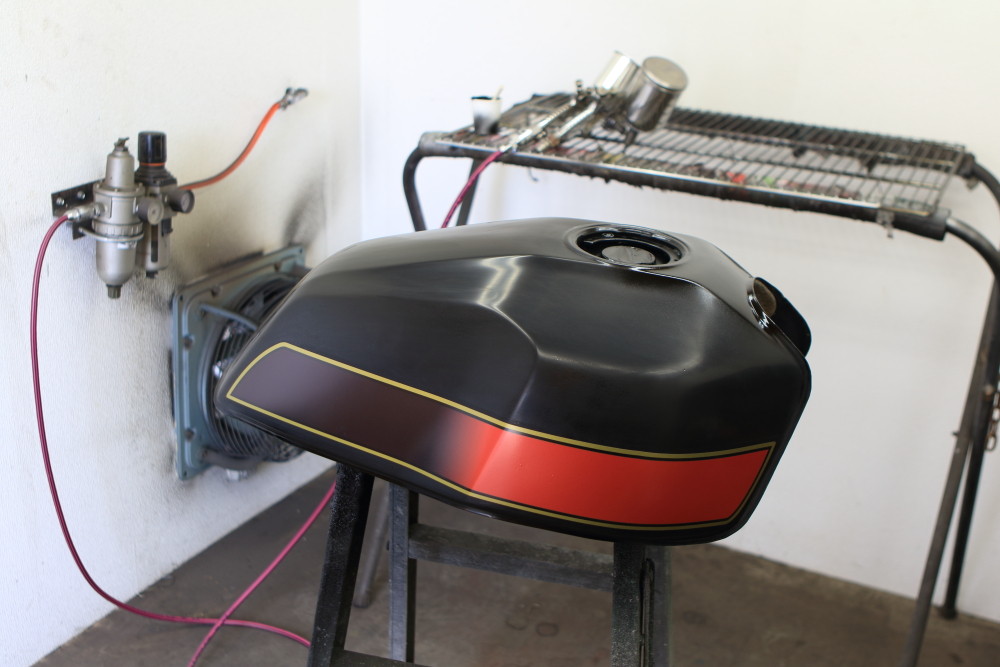 とりあえず連休初日まであと4日しかないから今回はこのまま現状維持で乗って行けば? と言ったのですが、返事が少し残念そうに聞こえたのが気がかりで、バイトだ学校だでなかなか手伝いに来ず放置されていた外装だけでも仕上げてあげるべくタンクの外側を板金しながら内側の錆び取り処理を同時進行にて作業を進めて、外装が綺麗になってもキャブの調子が悪いんじゃ楽しくないかなぁ・・・なんて、それ以上にもしキャブのセッティングが出てないせいで皆と走るのが精いっぱいで周りに注意が働かずに事故とかされたら父親である仲間が悲しむよなぁ。。。とか強迫観念に囚われていたらやはりセッティングも出すことにw