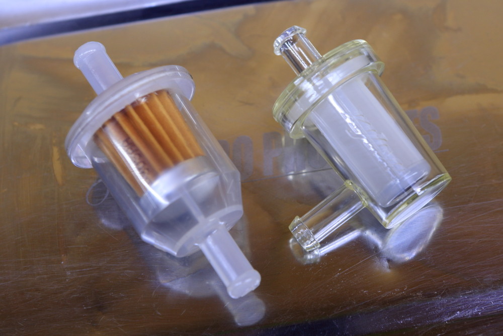 そして何度ジェッティングを変更しても高回転のセッティングが合わず、こんなに大きなジェットサイズ本当に必要か・・・?と思うくらいのサイズまで進み、何かがオカシイ・・・。と思ったら、当初画像左のフィルタータイプのフューエルフィルターを使ったのですが、どうもこいつのせいで高回転で燃料の流量が確保出来なかったようで、試しにメッシュ式のフィルターに交換したところ悩まされた症状も無くなり、セッティングも一からやり直して何とか完了。